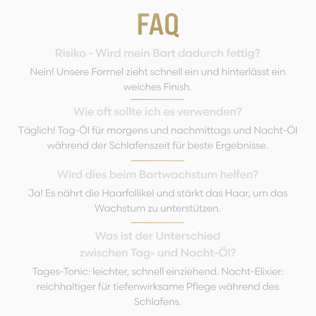 Erwache jeden Morgen mit einem weicheren und besser kämmbaren Bart, dank der täglichen Anwendung unseres Bartöls für die Nacht. Gönn deinem Bart die Pflege, die er verdient, und erlebe die Veränderung durch unsere innovative Formel - für einen Bart, der nicht nur gut aussieht, sondern sich auch großartig anfühlt.